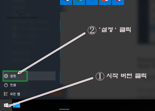 1. 좌측 하단의 '시작' 버턴 클릭 후 메뉴에서 '설정' 아이콘 클릭.(그림①)