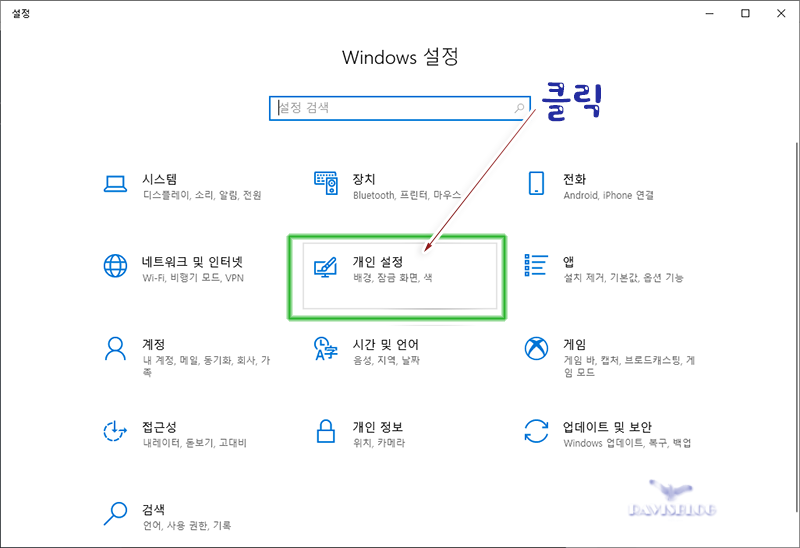2. 설정 창에서 '개인 설정' 클릭.(그림②)