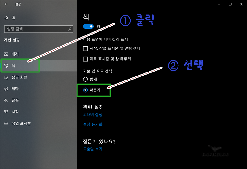 3. 좌측 사이드 메뉴에서 '색' 선택 후 우측 사이드 '기본 앱 모드' 항목에서 '어둡게' 선택.(그림③)