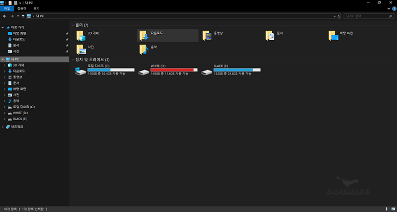 Windows10 파일 탐색기(File Explorer)에 어두운 스킨 적용하는 방법 입니다.