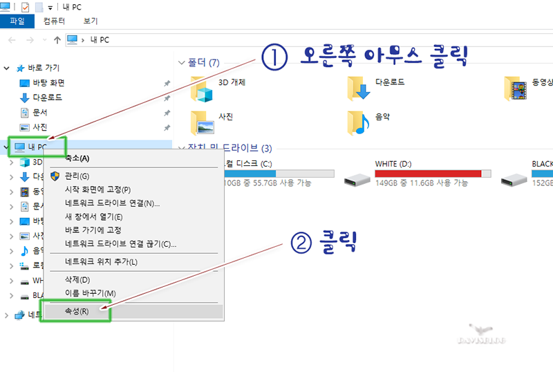 1. '내 PC' 아이콘에서 오른쪽 마우스 클릭 후 메뉴에서 '속성(R)' 클릭.(그림①)