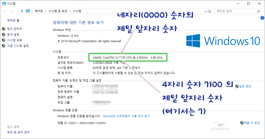아래 그림의 경우 CPU 모델 넘버는 i3-7100 입니다.