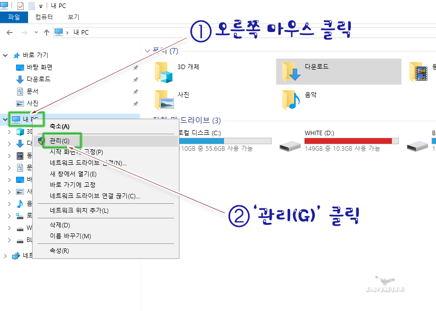 1. '내 PC' 아이콘에서 마우스 우클릭 후 메뉴에서 '관리(G)' 클릭.(그림①)
