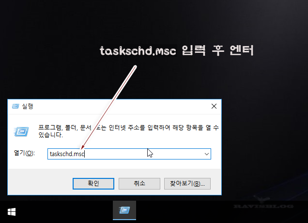 2. 입력 창에 'taskschd.msc' 입력 후 엔터.(그림②)