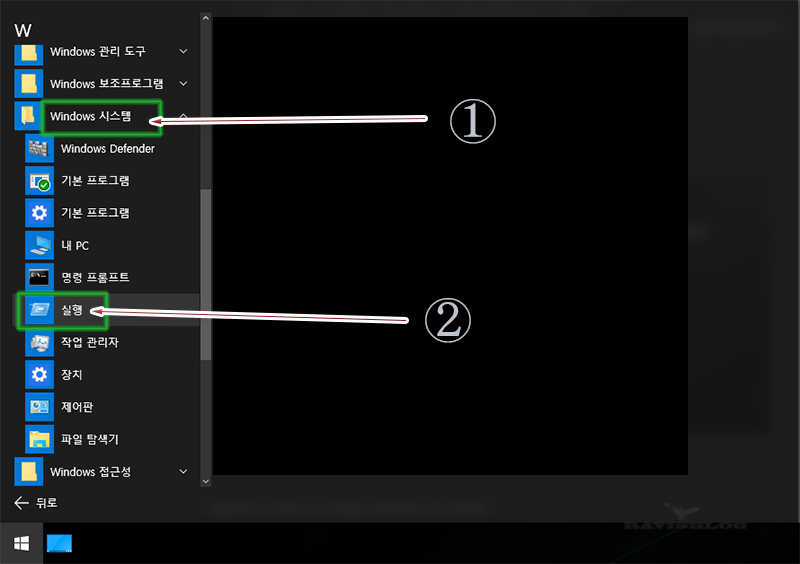 1. '시작 - 모든 앱 - Windows 시스템 - 실행' 클릭.(그림①)