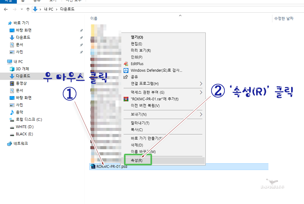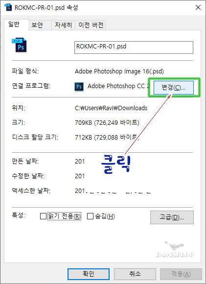1. 연결 프로그램을 변경하려는 확장자의 파일에서 우마우스 클릭 후 '속성(R)' 클릭.(그림①)