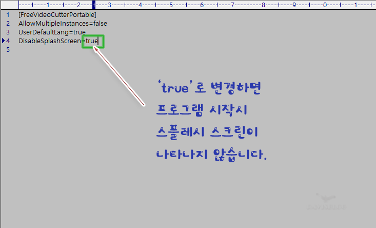 2. 'DisableSplashScreen' 값을 'true'로 변경해 준다.