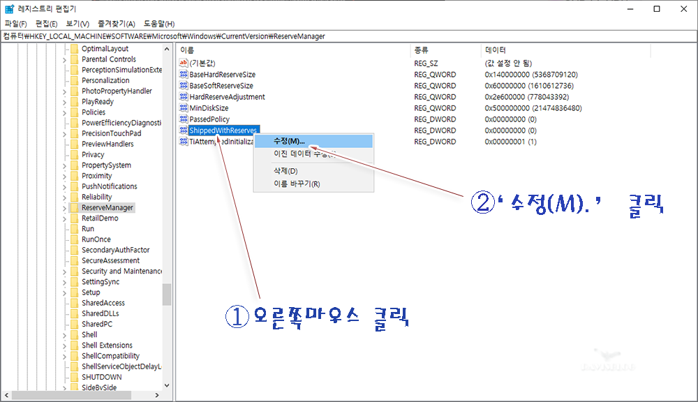 3. 우측 사이드에서 'ShippedWithReserves'을 찾아 오른쪽 마우스 클릭 후 '수정(M)...' 클릭.