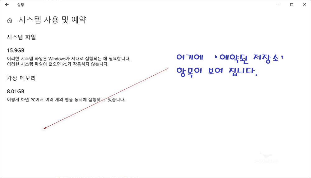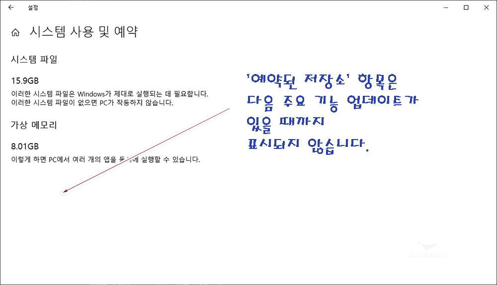 다음 주요 기능 업데이트가 있을 때까지 '시스템 사용 및 예약' 창에는 '예약된 저장소' 항목이 표시되지 않습니다.(그림⑤)