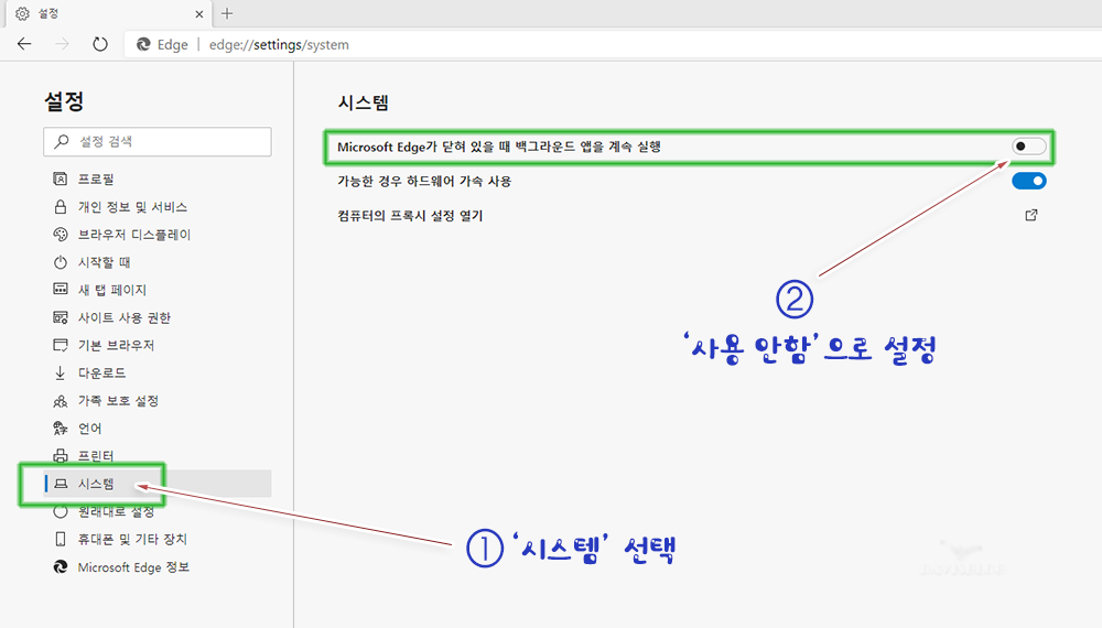 2. 좌측 사이드에서 '시스템' 선택 후 우측 사이드에서 'Microsoft Edge가 닫혀 있을 때 백그라운드 앱을 계속 실행' 항목 사용 안함으로 설정한다.(그림②)