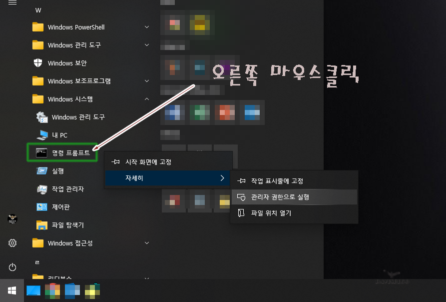 1. 명령 프롬프트' 메뉴에서 오른쪽 마우스 클릭 후 '자세히 - 관리자 권한으로 실행' 선택.(그림①)