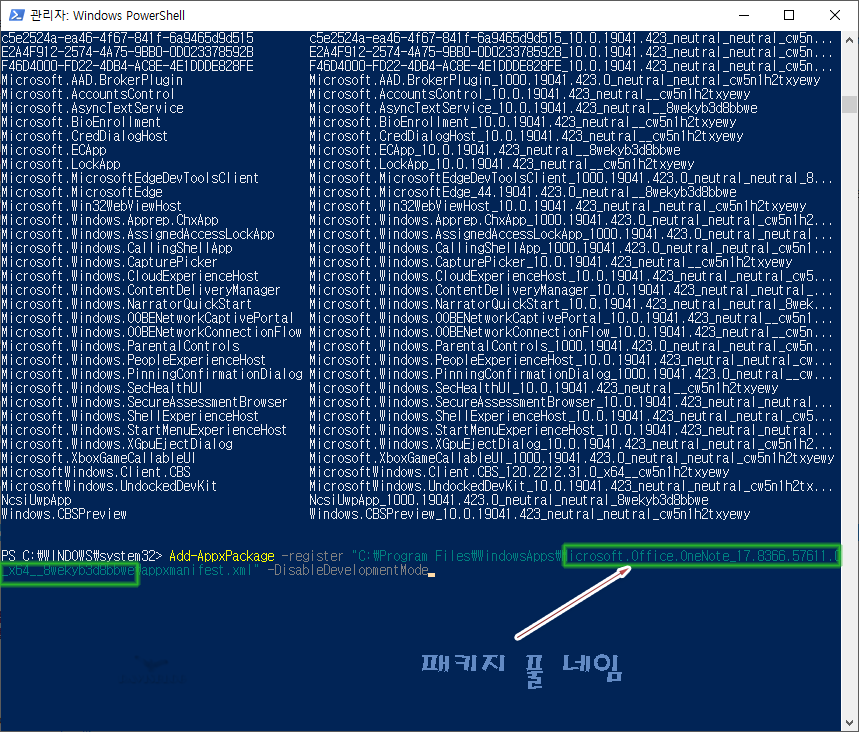 - Add-AppxPackage -register "C:\Program Files\WindowsApps\Microsoft.Office.OneNote_17.8366.57611.0_x64__8wekyb3d8bbwe\appxmanifest.xml" -DisableDevelopmentMode
