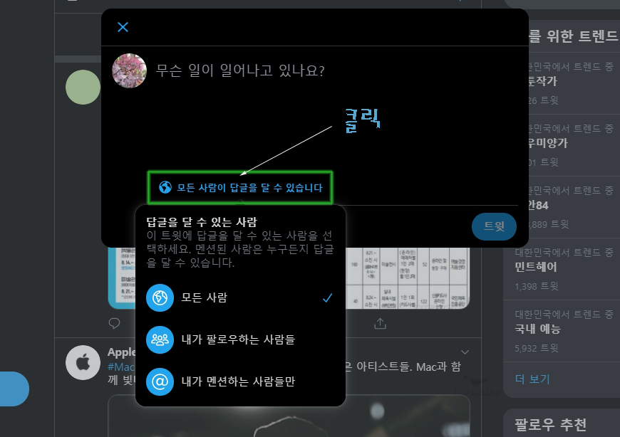 2. 트윗 작성 창 하단에 보이는 지구본 모양 아이콘 옆의 '모든 사람이 답글을 달수 있습니다' 클릭 후 원하는 옵션 선택.