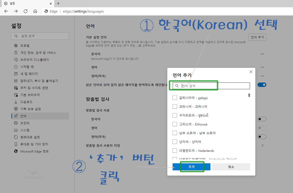 3. 보이는 'Add Languages(언어 추가)' 팝업 창에서 'Korean(한국어)' 선택 후 아래 'Add(추가)' 버턴 클릭.(그림③)