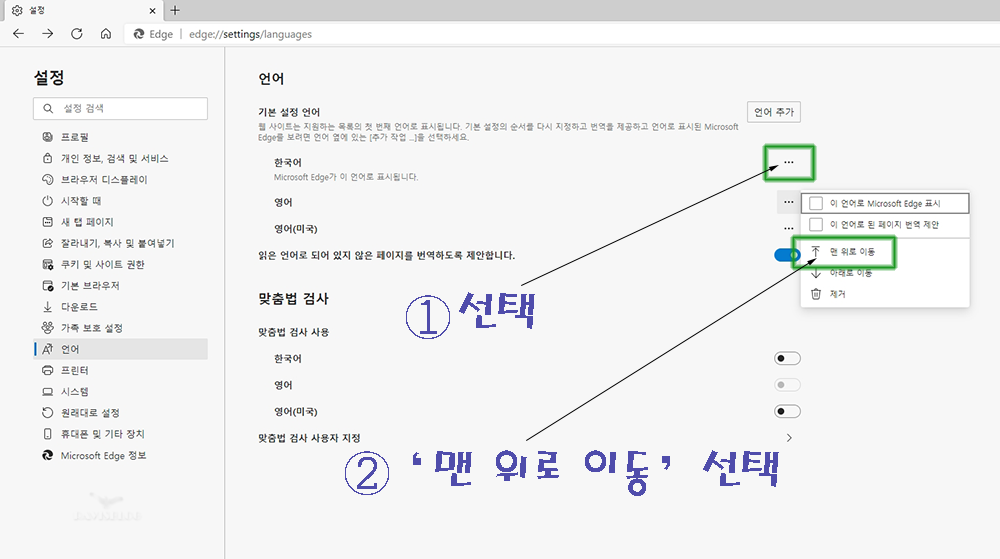- MS 엣지(Edge) 설치 후 원하는 언어로 변경하는 방법 입니다.