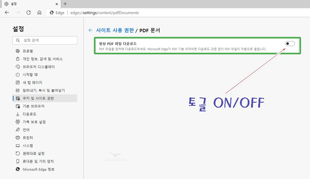 3. 'PDF 파일 다운로드' 옵션 우측에 보이는 토글 버턴 ON/OFF 선택.(그림③)